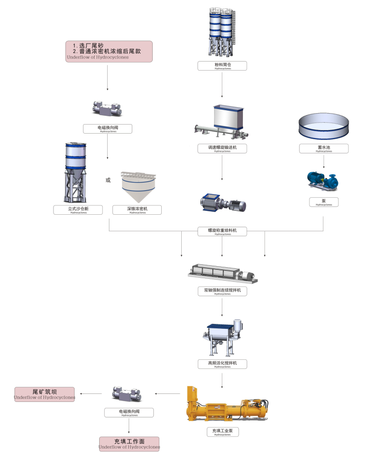 桑尼對全尾砂進行濃密脫水,使全尾砂達到膏體狀態(tài),全尾砂膏體經(jīng)計量后供料給強制攪拌機,在攪拌機中添加膠結(jié)劑,其他充填集料經(jīng)濃度調(diào)節(jié)后,攪拌制備成膏體填充料。然后用液壓雙缸活塞泵加壓或通過自然壓頭經(jīng)充填鉆孔及井下管網(wǎng)輸送至井下進行填充。高質(zhì)量充填尾砂無需進行分級而沖入井下,可保護礦區(qū)地表,減少或避免尾礦堆放占地,有效保護礦區(qū)及周邊生態(tài)環(huán)境,還可為采礦作業(yè)提供良好的條件,從而可更大程度地提高礦石資源回收率,使礦山獲得更大的經(jīng)濟效益及良好的社會環(huán)境效益。